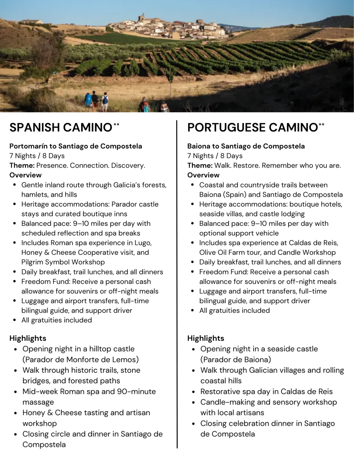 Afternoons offer space for restoration, embodied movement, and shared learning with guides in yoga, wealth, mindset, and creative growth. Evenings invite laughter, truth, and stillness as the day’s miles unfold into meaning. This journey evolves as you walk—crafted for women who lead, give, and hold so much—and who are now ready to receive.